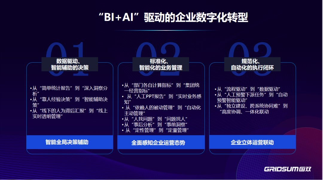 国双自研增强型数据分析工具GVP(智能可视化分析平台)是以“数据驱动”为核心,融合了数据接入与分析处理、2/3D可视化、AI+预测、智能协同、移动应用等功能,新一代面向企业端到端的指挥作战决策平台。GVP在实际使用中,具备操作便捷等特点,非技术人员在0代码的情况下也能实现复杂内容的制作,操作成本极低。目前,GVP服务企业包括三桶油、招商局集团、中车唐山等众多超大型央企、国企,拥有丰富的项目实践经验。在标准制定过程中,国双于数据准备、智能交互等各个维度均提供了丰富的项目经验与制定意见,积极推动增强型数据分析工具在行业及国内的发展。