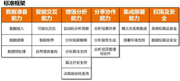 《增强型数据分析工具技术要求》标准将增强型数据分析工具能力细化为数据准备能力、智能交互能力、增强分析能力、分享协作能力、集成部署能力、权限及安全6大能力域,共18个能力子域,77个能力项。
