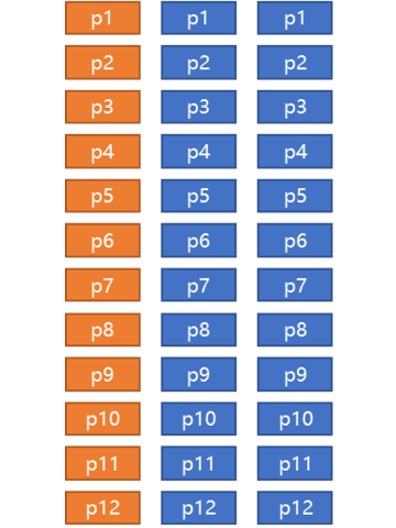 在模型2中,我们将节点每三个组成一个组,每个组的每个节点,所包含的副本来自相同的分片,如上图所示。p1-p6、p7-p12各属于一个组。我们枚举一下可能出现的情况: