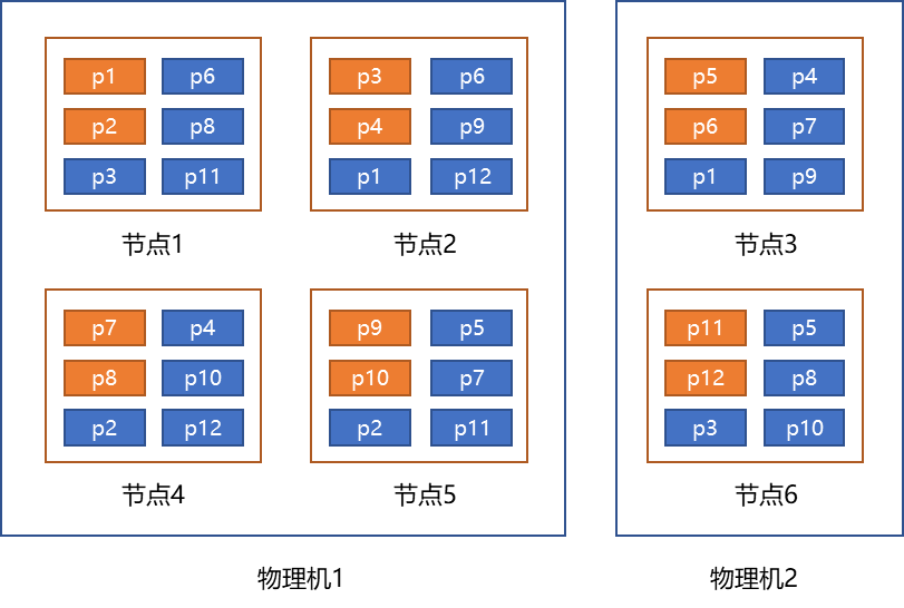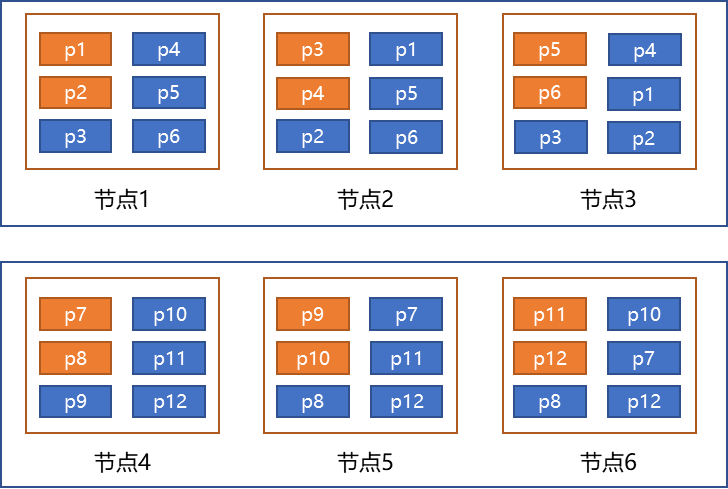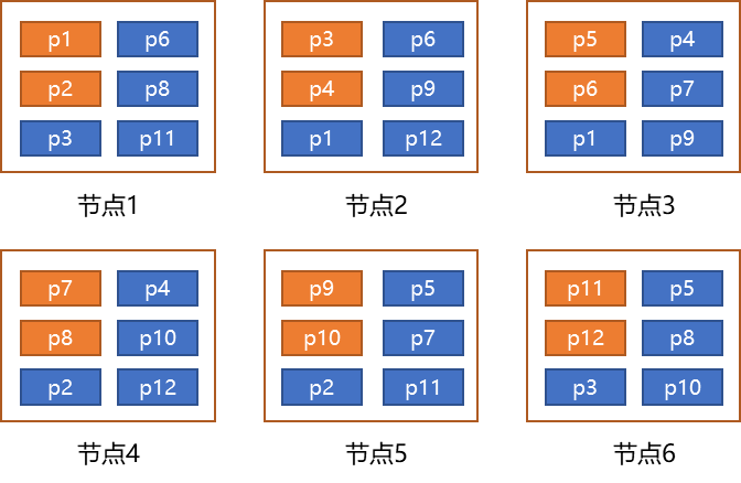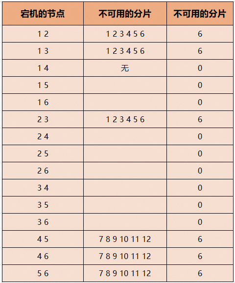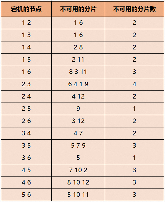 例如,节点1和节点2同时宕机,由于p1、p6均有两个副本在这两个节点上,因此p1和p6处于不可用的状态。