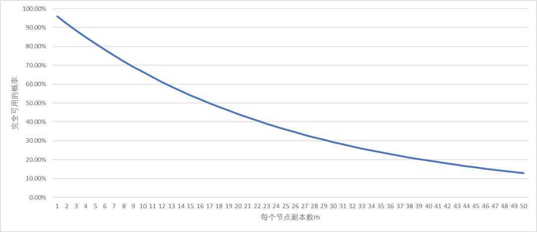 可以直观发现,可用性会随着m的增长,迅速下降。当m=1(每个机器只存一个副本的情况下),可用性最高,达到96%。