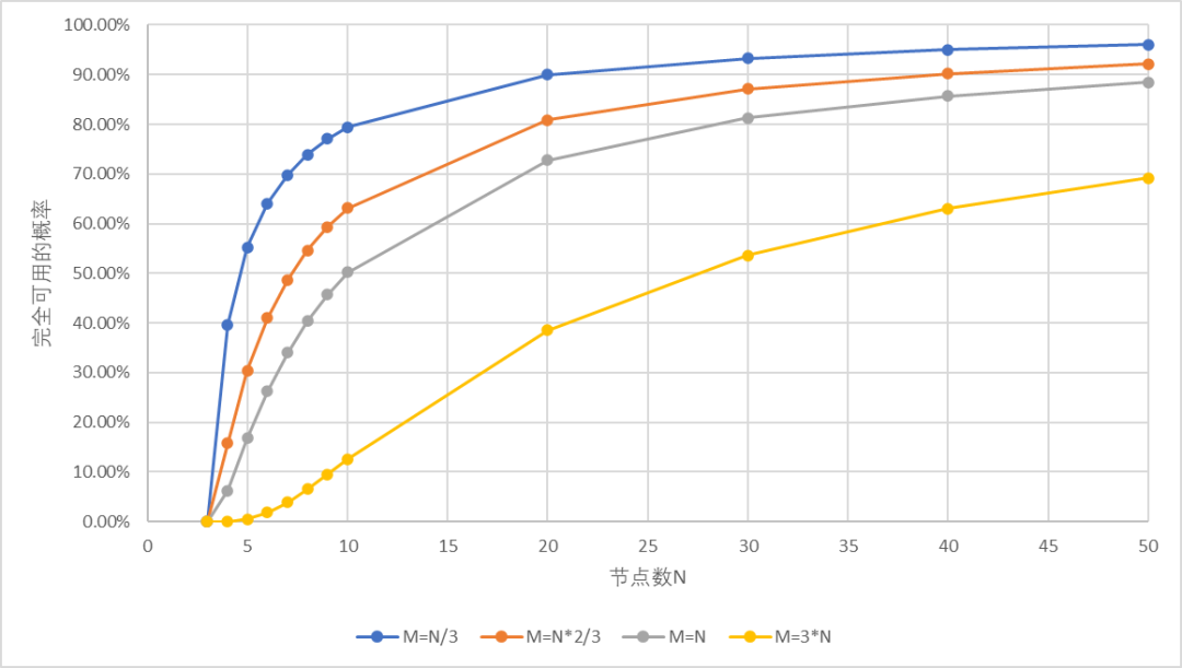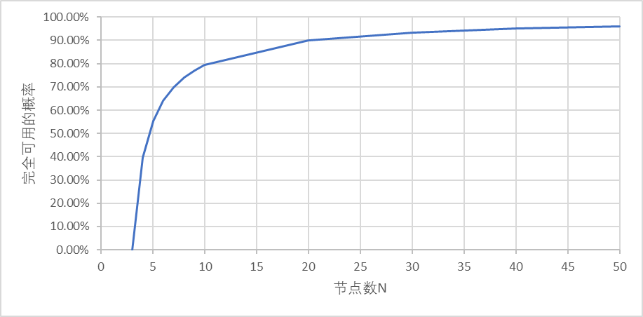 我们可以看到,随着机器数的增加,可用性会迅速增加,20个节点的时候便能超过90%。