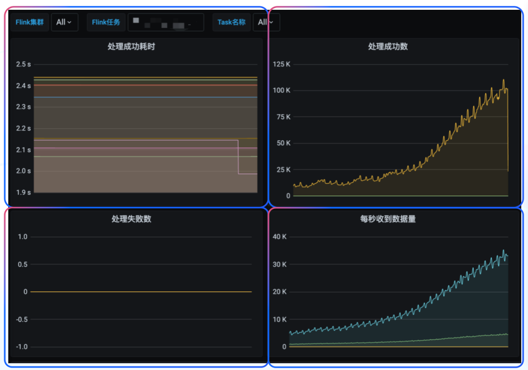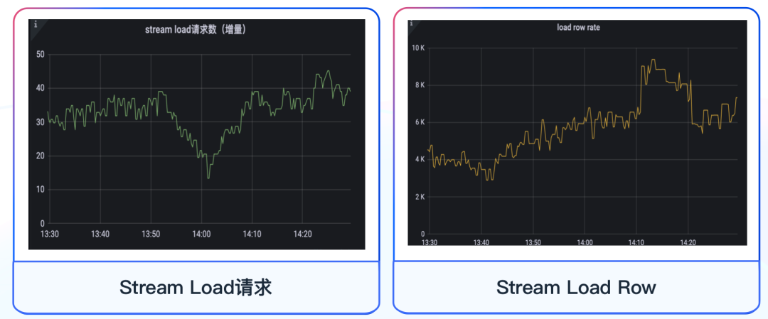 在集群监控层面,我们采用了社区提供的监控模板,从集群指标监控、主机指标监控、数据处理监控三个方面出发来搭建 Doris 监控体系。其中集群指标监控和主机指标监控主要根据社区监控说明文档进行监控,以便我们查看集群整体运行的情况。除社区提供的模板之外,我们还新增了有关 Stream Load 的监控指标,比如对当前 Stream Load 数量以及写入数据量的监控,如下图所示: