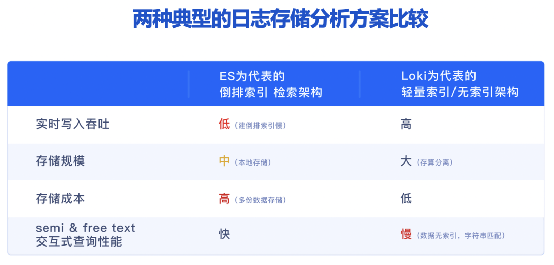 当前业界有两种比较典型的日志存储与分析架构,分别是以 Elasticsearch 为代表的倒排索引检索架构以及以 Loki 为代表的轻量索引/无索引架构,如果我们从实时写入吞吐、存储规模和成本、实时交互式查询性能等几方面进行对比,不难发现以下结论:- 以 ES 为代表的倒排索引检索架构,支持全文检索、查询性能好,因此在日志场景中被业内大规模应用,但其仍存在一些不足,包括实时写入吞吐低、消耗大量资源构建索引,且需要消耗巨大存储成本;