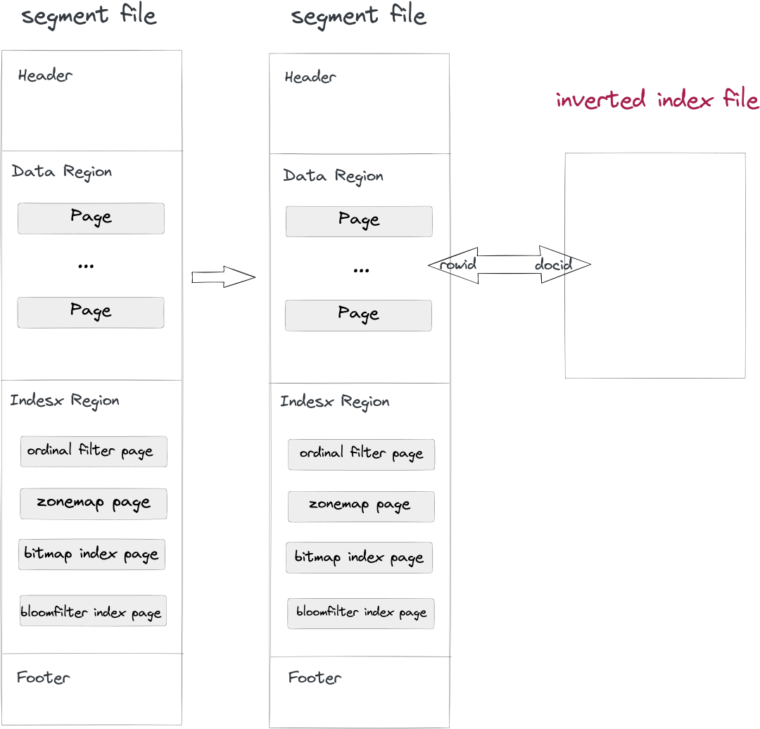 原有索引结构很难满足日志场景实时文本检索的需求,因此设计了全新的倒排索引。倒排索引在设计和实现上我们采取了无侵入的方式、不改变 Segment 数据文件格式,而是增加了新的 Inverted Index File,逻辑上在 Table 的 Column 级别。具体流程如下:- 数据写入和 Compaction 阶段:在写 Segment 文件的同时,同步写入一个 Inverted Index 文件,文件路径由 Segment ID + Index ID 决定。写入 Segment 的 Row 和 Index 中的 Doc 一一对应,由于同步顺序写入,Segment 中的 Rowid 和 Index 中的 Docid 完全对应。
