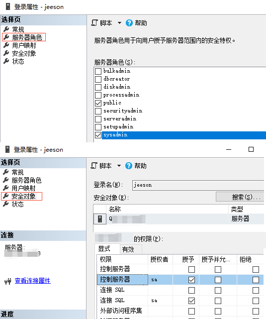 --授权服务器角色权限 sysadminALTER SERVER ROLE sysadmin ADD MEMBER jeesonGO--授权服务器权限 CONTROL SERVERGRANT CONTROL SERVER TO jeesonGO