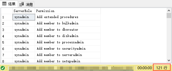 可以看到,sysadmin 有121项权限,可以说包含了实例的所有权限。