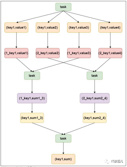 当使用了类似与groupByKey、reduceByKey这样的算子时,可以考虑使用随机key实现双重聚合,如图: