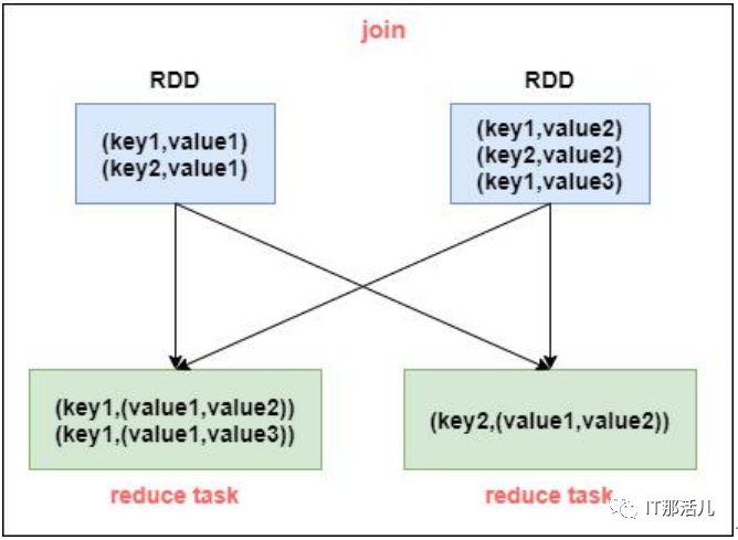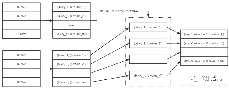 一般情况下,join操作都会执行shuffle操作,并且执行的是reduce join操作,也就是将所有相同的key对应的数据汇聚到一个reduce task中,然后再进行join,普通join过程如下:很明显是经过了shuffle过程,就是将相同key对应数据拉取到同一个shuffle read task中再进行join。但是如果join的一个RDD比较小,那么可以采用广播的方式将小RDD全量数据+map算子来实现与join相同的效果,也就是map join,此时不会产生shuffle操作,也就不会产生数据倾斜的。注意:RDD并不能直接进行广播,需要通过collect算子将数据拉取到Driver内存中再进行广播。将小RDD通过collect算子拉取到Driver端内存中,然后对其创建一个broadcast变量 ,然后对另一个RDD执行map算子,再算子函数内,从broadcast变量中获取小RDD全量数据,与当前RDD按照key进行比对,如果连接的key相同,就将两个RDD数据用需要的方式连接起来。这种情况下根本就不会产生shuffle操作,就避免了数据倾斜的问题。此方法适合join操作中有一个RDD数据量较小时。