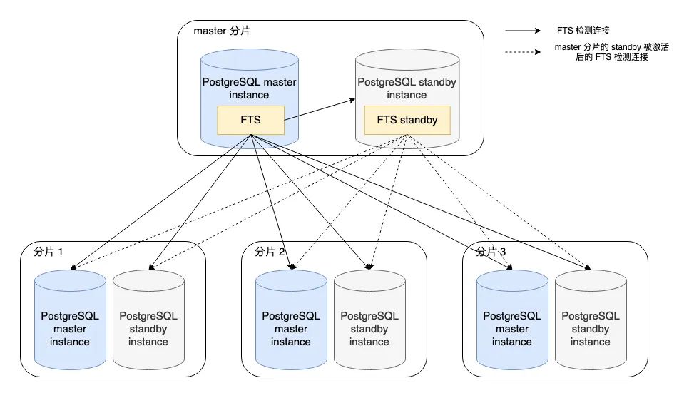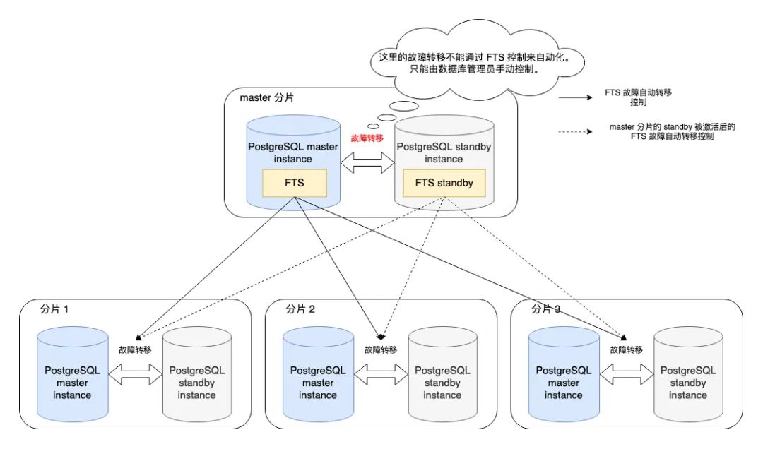 虽然 master 数据库实例同样可以设置一个 PostgreSQL 后备实例 ( standby ) 来实现该数据分片的数据多副本存储(其中同样包含一个后备的 FTS 服务),但是由于 FTS 服务是 master 数据库实例的一部分,它并不能提供本身数据分片的故障自动转移。当 master 的 PostgreSQL 数据库实例因为故障而不能工作时,需要数据库管理员手动通过 gpactivatestandby 命令激活其后备实例来实现该数据分片的故障转移。