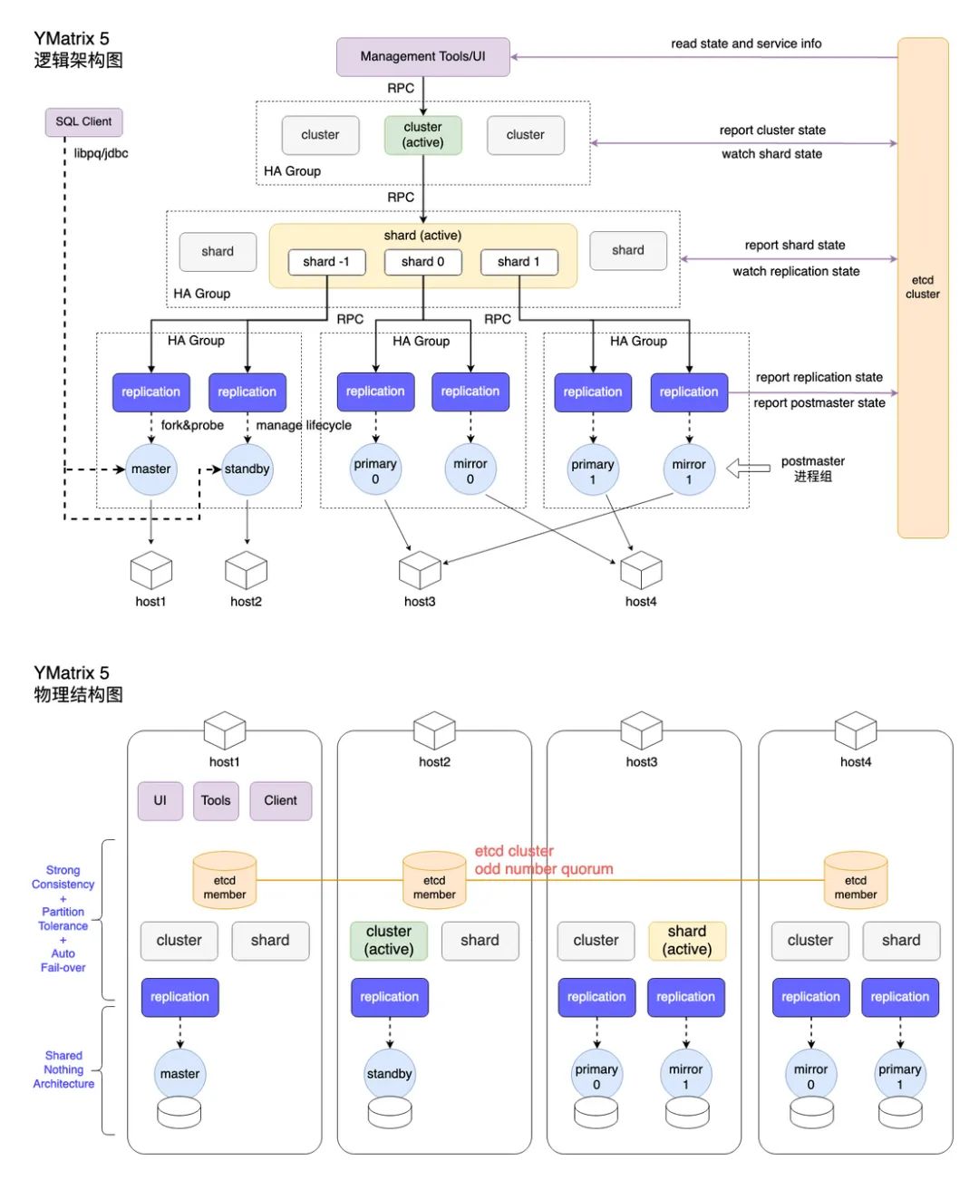 YMatrix 5.0 彻底移除了 FTS 的实现,并引入了新的数据库集群组件 (etcd 和集群状态管理组件,包括 cluster 服务、shard 服务、replication 服务等) 来实现完全的故障自动转移功能。