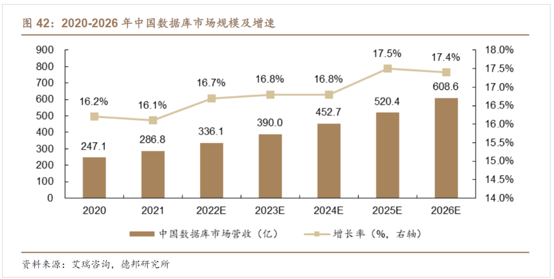 从数据库整体市场规模来看,德邦证券吴开达等人在4月13日研报中指出,国产数据库劲头旺盛,2021年中国数据库市场总规模达286.8亿元同比增长16.1%,CAGR(2021-2026e)达16.2%。