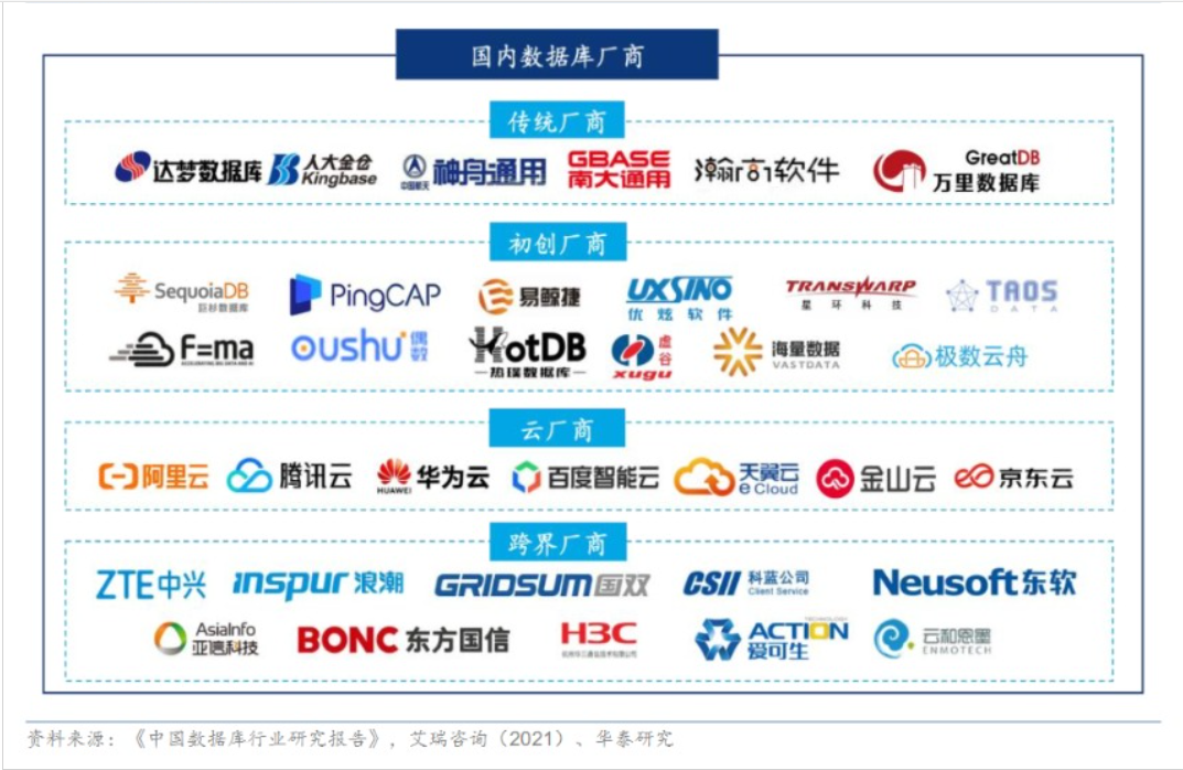 华泰证券在研报中指出,国产数据库参与厂商包括传统厂商、初创厂商、云厂商和跨界厂商四类。涉及上市公司包括阿里巴巴、腾讯、中兴通讯、浪潮信息等。