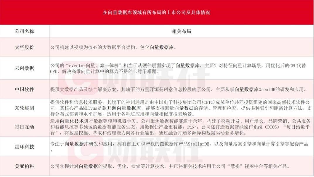 细分领域来看,据财联社不完全统计,涉及向量数据库的上市公司包括大华股份、云创数据、中国软件、东软集团、每日互动、星环科技和美亚柏科等,具体情况如下: