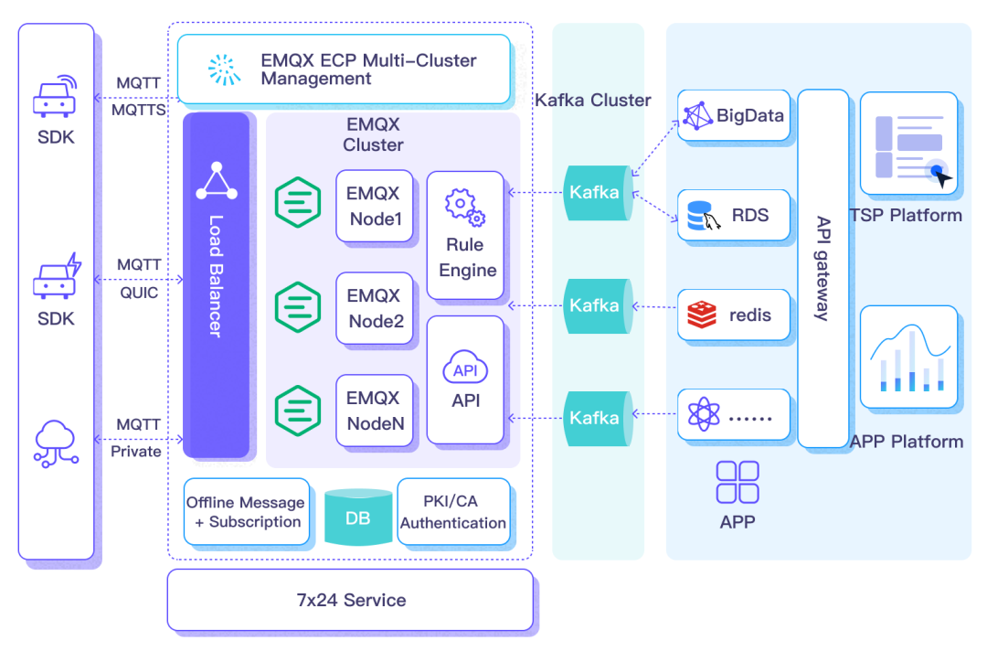 灵活集成:EMQX 支持数据桥接和 API,使网联汽车解决方案提供商能够无缝连接各种云端数据库、消息队列和后端系统(如传感器和资讯娱乐系统等)。这有助于用户构建能够与多种系统架构集成的创新应用。