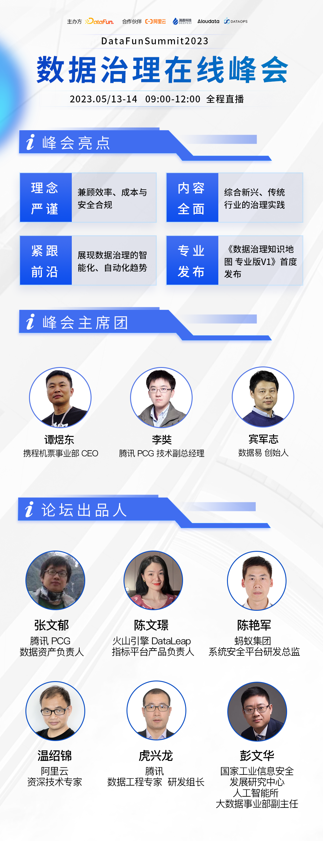 个人介绍:谭煜东2014年加入携程,先后任机票事业部技术总监,CTO, CEO。此前在英伟达,Yelp, 微软等多家科技公司从事研发工作。毕业于佐治亚理工学院,获计算机工程博士学位。个人介绍:李奘,腾讯PCG技术副总经理。宾西法利亚州立大学博士,长期致力于机器学习、大数据、数据科学和增长技术体系与方法论的研究和应用。曾在硅谷Cisco,Linkedin等公司任职,回国后在滴滴任杰出算法工程师负责增长、数据挖掘、NLP、知识图谱和智能客服等方向。当前在腾讯负责PCG的推荐中台、画像中台和数据治理平台等多个项目,并负责OVBU大数据体系建设以及PCG的AI委员会的规划发展。个人介绍:宾军志,数据易(北京)信息技术有限公司创始人,中国电子信息行业联合会数据要素市场促进会秘书长,国家信息技术标准化技术委员会大数据标准化工作组成员。长期参与国内外大数据领域的架构设计,规划与实施等工作,对数据质量、主数据、数据治理、数据管理能力成熟度评估等数据相关的领域有很深的研究和实践。