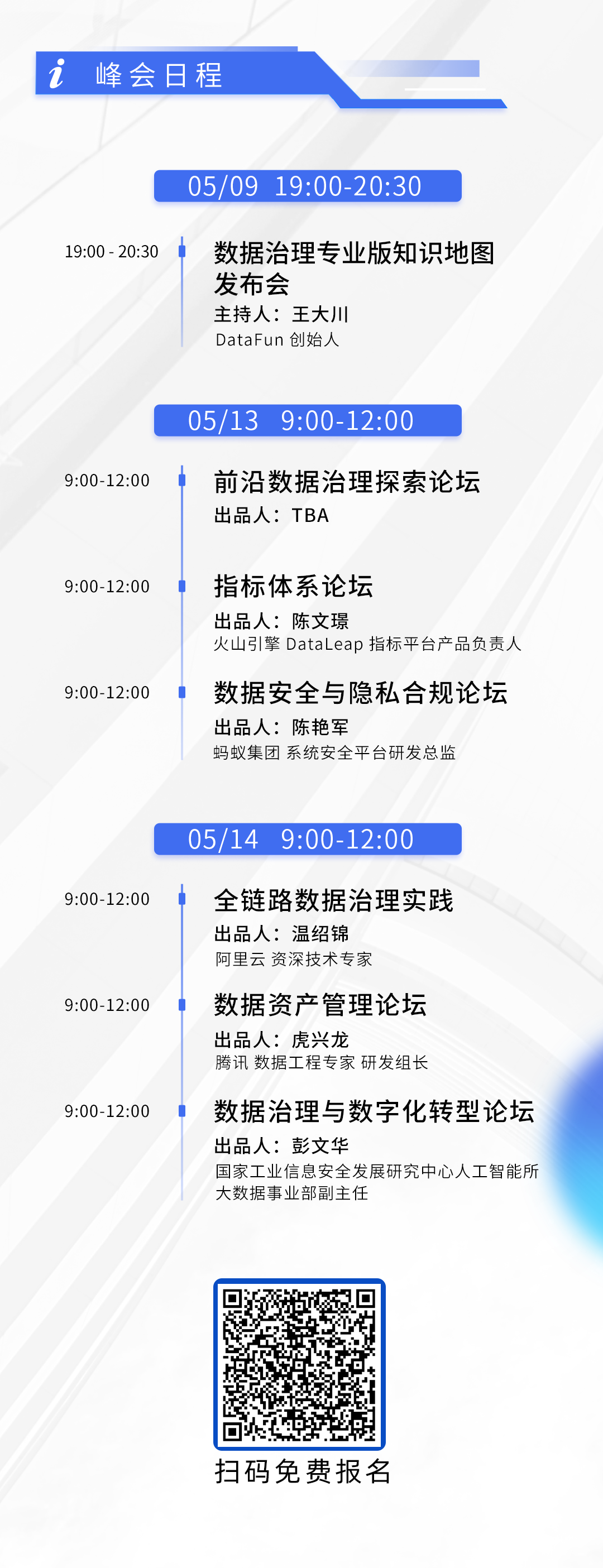 如何做好数据治理这件事儿?优秀的数据治理范例长什么样?2023年5月13-14日,DataFun将举办第3届数据治理在线峰会。本次峰会由2位主席与2位专家团成员和6位论坛出品人精心策划而成,共包含了:前沿数据治理探索、指标体系、数据安全与隐私合规、全链路数据治理实践、数据资产管理、数据治理与数字化转型等6个论坛,邀请20余位来自一线的数据治理专家,进行深度分享交流。本次峰会将全程直播,欢迎大家识别下面任意海报二维码报名收看。