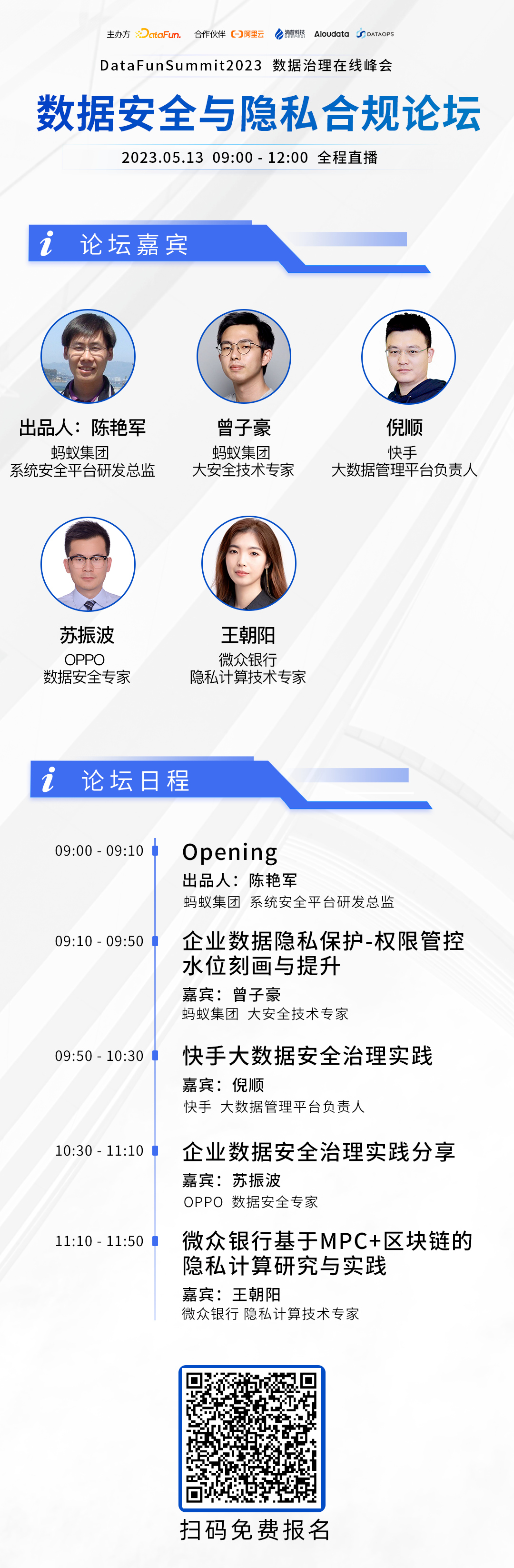 个人介绍:陈艳军(千剑),蚂蚁集团系统安全平台研发总监。在数据安全和网络安全领域有近十年的研发经验,深耕数据识别与追踪、风险检测与响应、隐私合规与保护等技术,目前致力于以数据为中心的数据安全防控体系及数据驱动的生态信息泄漏治理体系建设及落地。个人介绍:专注于大数据领域下数据管理建设,包括数据安全和质量、元数据平台、大数据资源管理等方向。演讲提纲:随着大数据时代的来临,数据是公司的核心竞争力,数据的泄露会给公司带来严重的损害。面对快手不同业务线的复杂数据安全场景、OLAP每天亿级查询和HDFS百万级QPS,快手大数据安全是如何满足安全管控的灵活性和精细化的同时,又保证平台的高可用和高性能呢?本次分享将介绍快手大数据安全面临的挑战、解决思路、安全体系的建设、安全平台的架构设计及关键技术;同时介绍大数据架构HIVE/OLAP/HDFS的建设思路及隐私合规等安全治理实践。主要内容包括:1. 统一大数据安全平台的权限模型、高性能插件的建设思路个人介绍:曾子豪(允川) ,蚂蚁集团大安全技术专家。自蚂蚁入职以来一直从事4A领域,经历主导蚂蚁多代权限平台升级,目前负责蚂蚁身份与权限管理2.0平台建设。演讲题目:企业数据隐私保护-权限管控水位刻画与提升1. 了解企业权限管控水位刻画方法,从哪些方面提升企业权限管理水位个人介绍:数据安全专家,曾先后服务于腾讯、CETC、中兴等公司,8年数据安全领域经验,在数据安全治理、数据安全产品规划以及企业数据安全建设方面有丰富的实践经验,曾负责腾讯云数据安全产品和解决方案规划、设计和运营。现负责OPPO云数据安全治理能力建设,支撑业务安全、高效、合规处理数据。个人介绍:微众银行区块链与隐私计算技术专家,专注于隐私计算、密码学技术研究,隐私计算平台建设与应用推广。演讲题目:微众银行基于MPC+区块链的隐私计算研究与实践演讲提纲:随着数据成为新一代生产要素,数据价值及其重要性毋庸置疑。但同时《网络安全法》、《数据安全法》、《个人信息保护法》等法规的逐步落实,也对数据安全与隐私合规提出国家立法层面的要求。在此背景下,隐私计算或将成为一种可能的解决之道,在保护数据隐私的前提下实现数据价值跨域流通与转化。本次分享将介绍微众银行融合区块链与安全多方计算(MPC)的隐私计算技术路线、隐私平台建设及落地实践。主要内容包括:3. 启发自身哪些业务可以进一步提升数据安全与隐私合规