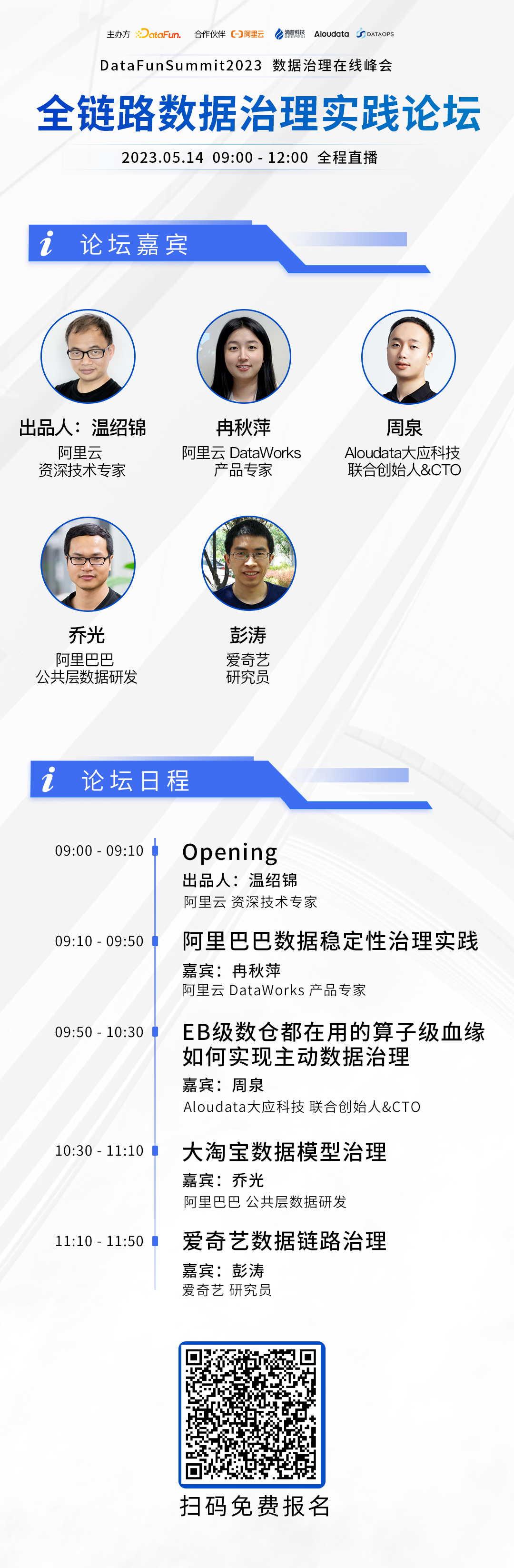 个人介绍:温绍锦,阿里云资深技术专家,花名高铁,阿里大数据开发治理平台 DataWorks 负责人。个人介绍:阿里云大数据开发治理平台DataWorks PD,主要负责数据治理领域相关产品建设。演讲提纲:围绕数据稳定性治理领域进行交流,分享基于阿里大数据开发治理平台的实际稳定性治理案例,探讨如何确保数据加工服务链路中的稳定性和可靠性,以及治理工作需达成的增效降损目标。周泉 Aloudata大应科技 联合创始人&CTO个人介绍:Aloudata联合创始人&CTO 周泉,拥有十余年大数据平台架构经验。在 EB 级金融数据平台基础架构、数据治理、隐私安全等多个领域有成熟实践并取得显著成效。周泉先生曾任蚂蚁集团数据平台架构师、蚂蚁数据治理一号位,主导了蚂蚁通用实时智能决策平台、主动数据治理、大数据安全合规技术体系等平台构建及架构演进,带领团队在大数据领域获得了十余项技术专利,深度参与了多项大数据领域国内国际技术标准制定。演讲题目:EB级数仓都在用的算子级血缘如何实现主动数据治理2. 数据越来越难管,主动数据治理如何让数据管理更智能、更自动3. 基于算子级血缘实现对EB级数据的主动数据治理1. 头部互联网/金融企业在管理EB级数据上,有哪些值得借鉴的前沿技术及实践?2. 元数据、血缘等平台能力应如何演进,以支撑数据治理从被动到主动的变革?3. 实现全链路算子级数据血缘,有哪些关键技术挑战?个人介绍:八年阿里大数据研发经验,负责交易、会员等多领域数据研发,独立构建钉钉数据公共层等。在数据计存治理、模型治理方面有丰富的经验,专注于数据架构、模型治理和提效等领域。演讲提纲:大淘宝技术数据体系经过多年发展,通过丰富的数据和产品支撑了复杂的业务场景,在数据领域取得了比较大的优势。随着数据规模越来越大,开发人员越来越多,虽有阿里大数据体系规范进行统一管理,但是由于没有在产品侧进行有效的模型设计和管控,在模型规模、规范性、公共层复用性、应用层效率等方面出现了计存成本提高、数据开发和消费效率降低、规范减弱、数据使用难度变大、运维负担增加等问题。为了解决这些问题,我们结合多年的模型经验,从定义问题、设计开发评估体系、专项治理实践、与阿里云DataWorks产品团队深度合作、抽象出解决方案等环节全面系统地对大淘宝数据进行了模型治理,在数据服务业务的同时,追求极致的数据开发和提效目标。主要内容包括:个人介绍:2017年加入爱奇艺,主要负责爱奇艺流量反作弊和渠道反作弊工作。随着公司数据治理项目的开展,开始参与并推进爱奇艺数据治理的部分工作,覆盖内容包括:Pingback质量评估、数据异常监控、数据链路等。演讲提纲:本次主要分享爱奇艺在数据链路治理工作的实践和尝试,包括离线链路治理、实时链路治理、数据异常监控等工作如何保障爱奇艺核心数据的质量和时效性。