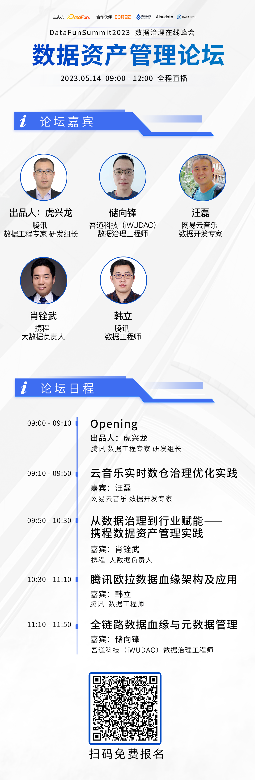 个人介绍:11年大数据领域从业经验,擅长大数据平台技术架构、数据治理与分析平台建设,先后在百度、vivo、腾讯负责大数据平台、数据治理平台研发工作,目前担任腾讯数据工程专家、研发组长,负责腾讯欧拉数据治理平台的技术工作。个人介绍:杭州电子科技大学本科,2013年加入网易,10年数据开发经验,从0到1参与过云音乐数据平台建设工作,目前负责云音乐实时以及离线平台的搭建工作。演讲提纲:介绍实时数仓平台降本提效的实践经验:包含平台问题和现状、运动式治理的流程和效果、实时数仓技术优化带来收益、未来实时数仓治理的一些规划,具体包括:2. 运动式治理的实践经验:摸清现状,推进治理,控制增长个人介绍:储向锋,南京邮电大学硕士毕业,现负责南京吾道知信信息技术有限公司数据中心数据治理平台相关架构与实践。演讲提纲:面对数据多场景多治理手段的数据治理场景,如何记录数据的完整血缘关系;对于非结构化和数据驱动模型的场景,通过自动化和人工结合的方式进行变化跟踪和记录元数据。个人介绍:肖铨武,2009获数学博士学位。曾在阿里巴巴,微软,平安,太平洋保险等公司任职,在大规模数据处理、机器学习等方面有丰富的经验。自2016年加入携程以来,在深耕携程数据的同时,对旅游业大数据有深入的研究,并不断推进大数据技术在全行业的应用。演讲题目:从数据治理到行业赋能——携程数据资产管理实践个人介绍:在大数据领域有多年的工作经验,现在腾讯负责欧拉数据产品旗下的数据血缘模块,包含数据生产端、数据加工链路和数据应用端的完整的全链路血缘,涉及元数据采集、血缘解析、分层建设、血缘图谱搭建、血缘数据挖掘等多个环节。演讲提纲:主要介绍欧拉数据血缘的建设思路和整体架构,以及多项血缘数据挖掘的实际场景。包含1. 欧拉数据血缘建设的背景和思路;2. 数据血缘建设各个环节的具体方案及整体架构;3. 血缘数据挖掘的多项实际落地场景。