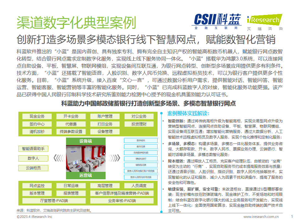近日,艾瑞咨询发布了《2023年中国银行业数字化转型研究报告》。科蓝软件凭借在银行数字化转型进程中做出的卓越贡献,荣登中国银行业数字化转型卓越服务厂商TOP50榜单。同时携手中国邮政储蓄银行打造的创新型多场景、多模态智慧银行网点项目案例,入选“渠道数字化典型案例”。