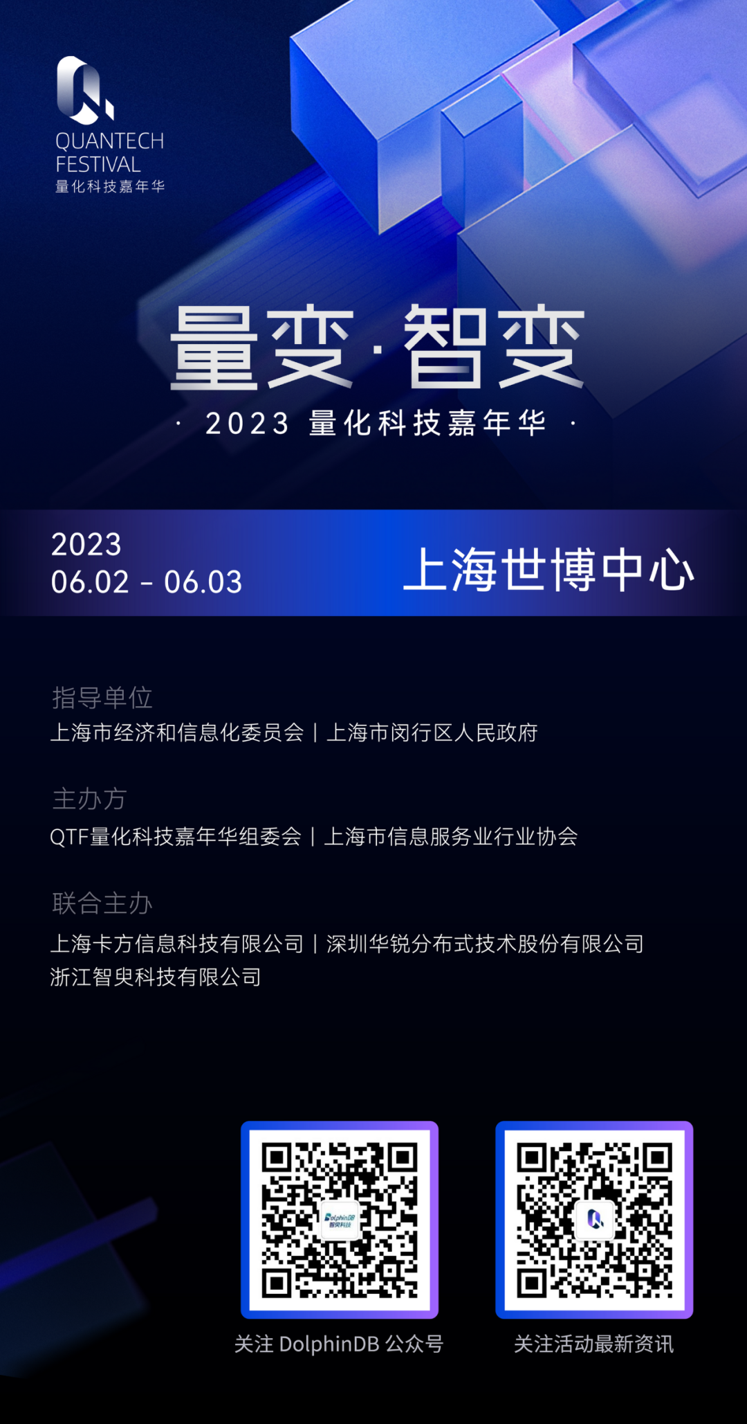 2023年6月2日至6月3日,DolphinDB 联合主办的“量变·质变” QuanTech Festival 量化科技嘉年华,将在上海世博中心盛大开幕!