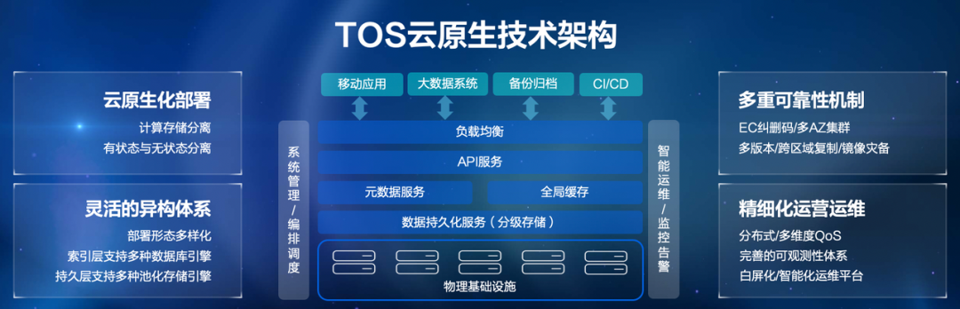 另一方面是防止数据"丢",追求企业级的高可靠性,TOS要做就做到极致,在满足用户确保硬件失效时的数据高持久性上,TOS数据可靠性可以达到高标准的企业级可靠性11个9,即99.999999999%,TOS采用分层的可靠性设计原则,从跨Region复制、多AZ LRC冗余,到AZ内网络和机架冗余、跨存储节点EC,再到存储节点内的全链路CRC、硬盘故障预测、后台数据校验和快速自动修复,全方位的可靠性设计保障用户数据稳若泰山。