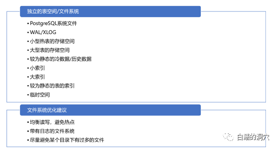 对于写入十分重的系统,WAL尽可能独立存储于高性能的独立磁盘上,避免与其他读写IO冲突。小型热表也可以存储于独立的表空间里。相对静态,但是会大规模扫描的冷数据独立存储,访问十分频繁的表的索引与数据分开等都是可以采取的IO隔离手段。具体要根据业务的特点去做规划。前面讨论的都是从本地磁盘的角度去考虑的,实际上目前大多数系统使用集中式存储,很多IO延时稳定性的问题可能要考虑后端存储的规划与优化,大家要注意这个问题。后端存储分过来的盘和实际的物理盘是不同的。