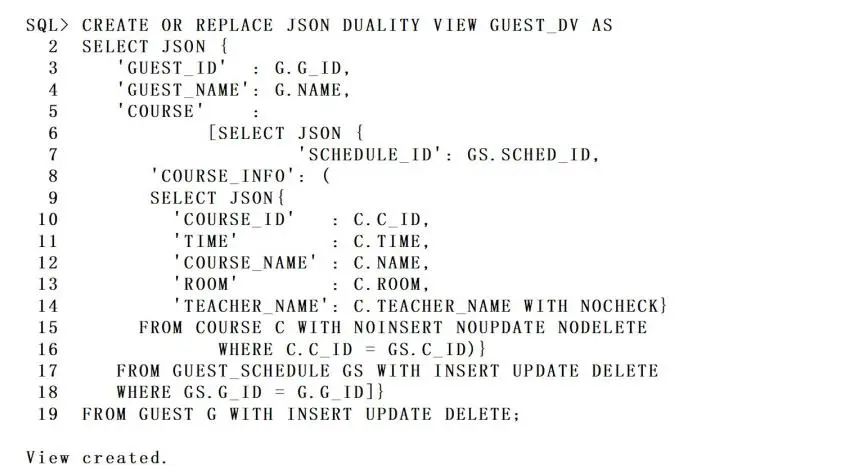其次,创建对应两表关系的Duality视图。这一操作将JSON关系定义放入其中,告诉Oracle数据取自于哪张表、它与其他表的关联关系,以及该数据是否可更新、可修改、可插入。