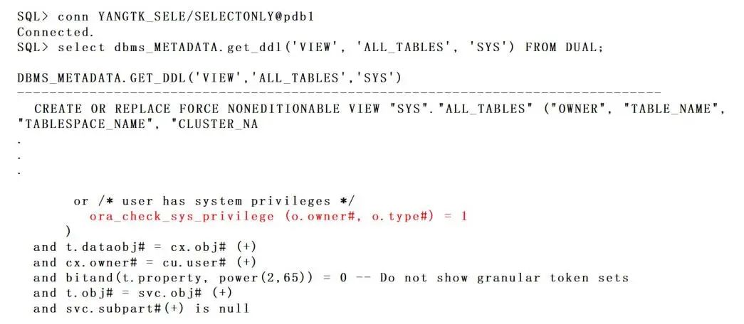 以往Oracle想要实现一个用户可以访问另一个用户下的所有表,需要把该用户下所有的表的访问权限依次授权给该用户。这一方式存在的问题是,每当源端用户新创建一个表时,还需要额外地给相关用户做授权。Oracle 23c的SCHEMA级授权特性较好地解决了以上问题。通过把SELECT ANY TABLE ON SCHEMA给到另外一个用户,来将原始用户查询的任何权限给到新的用户。授权后,用户除了获得CREAT SESSION的系统权限外,没有被授予任何其他系统权限和系统角色。而SCHEMA级授权是通过对象级的继承权限获得。此时,被授权的用户可以看到原始授权用户下所有的表以及数据。授权用户通过ora_check_sys_privilege函数获取当前是否具备访问权限,即若返回判断结果为1,则用户有查看权限,返回结果为0则无权限。6、DDL支持EXISTS