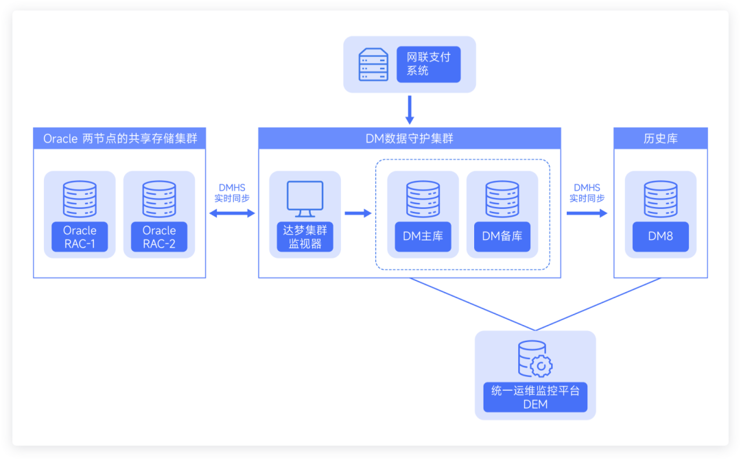 单机 DM8 存放历史交易数据,作为历史备查,由 DMHS 定期同步。
