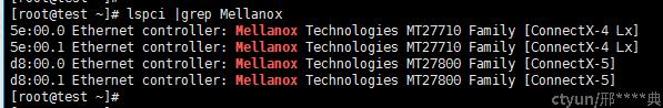 常用的IB网卡厂商有Mellanox,Intel。此处以Mellanox网卡实践,如下图所示test节点上有两块双端口Mellanox网卡,其中MT27800是100GE网卡,MT27710是25GE网卡,且已经工作在RoCE模式或TCP模式