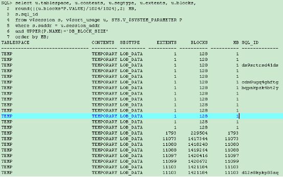 106G的临时表空间使用了102G,这么大的临时表空间使用率在一个正常的OLTP系统中是很罕见的。