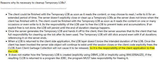 Oracle在对包含lob字段进行读取、修改或写入时均使用临时表空间TEMPORARY LOB_DATA段以缓存形式来存储这些临时数据。从以下Oracle对LOB临时段的解释中可以看出如果是通过过应用程序来访问LOB字段时Oracle并不会显式地去关闭或清理临时LOB,这是由于Oracle作为服务端并不知道客户端应用程序什么时候结束对LOB临时段的使用,何时应该清理是由应用程序确定的。