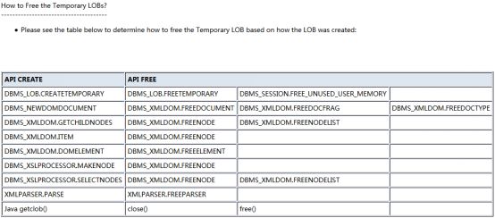 既然清理由应用程序确定,那么必然是程序开发语言是有这样释放lob缓存的代码的,比如对于Java程序有java.sql.NClob.free()这个方法来释放lob,对于其它通过调用 Oracle的API接口来实现的应用,oracle给出了相应如下的方法来释放Lob: