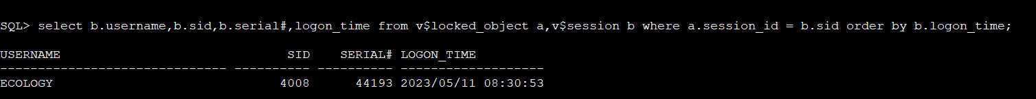 select b.username,b.sid,b.serial#,logon_time from v$locked_object a,v$session b where a.session_id = b.sid order by b.logon_time;