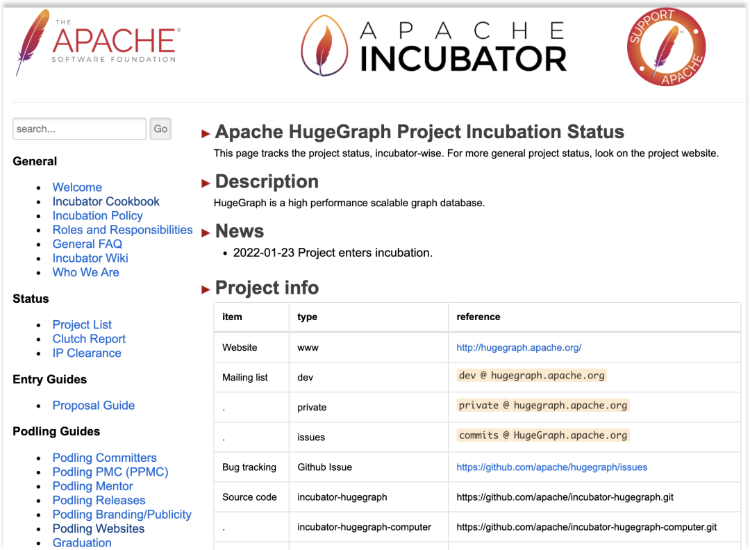 • HugeGraph 孵化进展:https://incubator.apache.org/projects/hugegraph.html