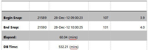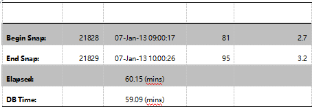 我们同样收集系统相对压力比较大的时间段1小时的工作日志,DBTIME 只运行 59分钟,为存在性能问题时间段(之前同一时间段DBTIME为532分钟)的10分之一左右。