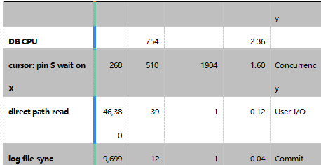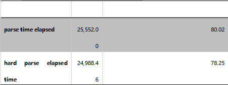 根据时间模型数据,可以看到60分钟之内,用于SQL或PLSQL解释的时间就占了80%以上,即25552秒,我们可以推测出由于与共享池相关的row cache lock等待事件导致了SQL解释出现问题,并最终大量的SQL运行变成缓慢,从于引发了系统的整体上性能问题。