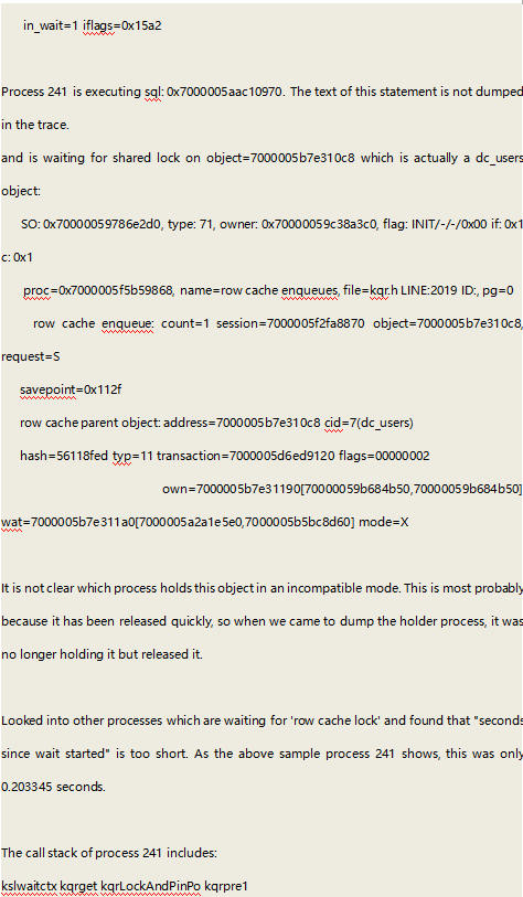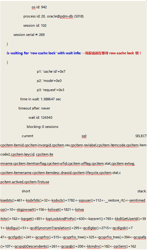 当前版本都是11.2.0.0.1出现大量row cache lock,而且都是短的大量的row cache lock等待。通过进一步分析系统底层调用都是ksedsts()+644<- ksdxfstk() +44<- ksdxcb()……等函数开头。