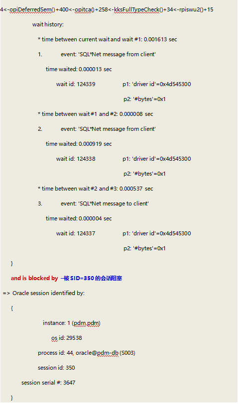 我们发现,当前大量的会话都是在等待nodenum=349(session id=350)的会话,然后再看具体会话TRACE信息,如下:
