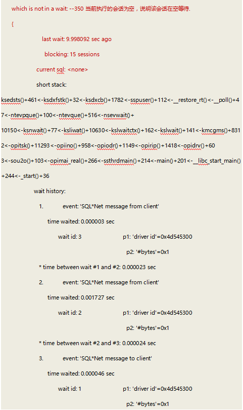 从上面的信息我们发现,上面row cache lock 的引发主要是由于在执行常规SQL语句等待另一个会话(SID=350)释放相关资源,可我们发现SID=350的会话当前却未执行任何SQL,而且是空闲等待,这是非常不合理的。