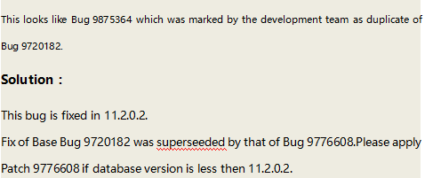 根据文档要求,该问题可升级到11.2.0.2以上版本或安装补丁包patch9776608解决问题。