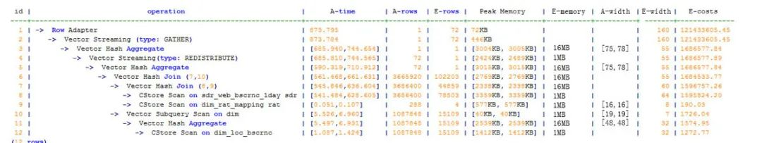 SELECT*FROM( ( SELECTSTARTTIME STTIME,SUM(NVL(PAGE_DELAY_MSEL,0)) PAGE_DELAY_MSEL,SUM(NVL(PAGE_SUCCEED_TIMES,0)) PAGE_SUCCEED_TIMES,SUM(NVL(FST_PAGE_REQ_NUM,0)) FST_PAGE_REQ_NUM,SUM(NVL(PAGE_AVG_SIZE,0)) PAGE_AVG_SIZE,SUM(NVL(FST_PAGE_ACK_NUM,0)) FST_PAGE_ACK_NUM,SUM(NVL(DATATRANS_DW_DURATION,0)) DATATRANS_DW_DURATION,SUM(NVL(PAGE_SR_DELAY_MSEL,0)) PAGE_SR_DELAY_MSELFROMPS.SDR_WEB_BSCRNC_1DAY SDRINNER JOIN (SELECTBSCRNC_ID,BSCRNC_NAME,ACCESS_TYPE,ACCESS_TYPE_IDFROMnethouse.DIM_LOC_BSCRNCGROUP BYBSCRNC_ID,BSCRNC_NAME,ACCESS_TYPE,ACCESS_TYPE_ID) DIMON SDR.BSCRNC_ID = DIM.BSCRNC_IDAND DIM.ACCESS_TYPE_ID IN (0,1,2)INNER JOIN nethouse.DIM_RAT_MAPPING RATON (RAT.RAT = SDR.RAT)WHERE( (STARTTIME >= 1461340800AND STARTTIME < 1461427200) )AND RAT.ACCESS_TYPE_ID IN (0,1,2)--and SDR.BSCRNC_ID is not nullGROUP BYSTTIME ) ) ;