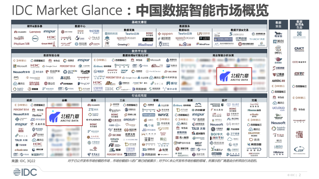 日前,领先的IT市场研究和咨询公司IDC发布了《Market Glance:中国数据智能市场概览,2022》报告。该报告提供了数据智能市场中各类产品的细分市场和技术产品,并梳理了解决方案供应商的主要代表。北极九章作为新一代数据增强型分析的领航者,凭借自主研发的增强型分析引擎和客户服务经验,入选“商业智能分析决策”和“金融行业应用”代表厂商。