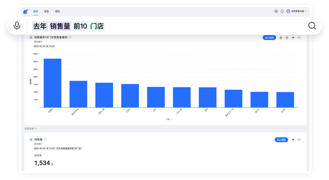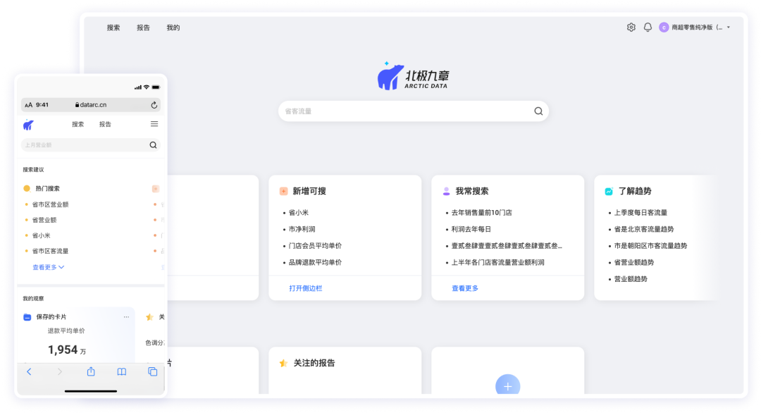 北极九章基于领先的NLP、机器学习技术,研发了一款人人可用的数据搜索和增强型分析引擎,颠覆传统的写代码查数据、拖拉拽搭建数据看板的交互方式,使用户能够用自然语言从企业海量数据中快速搜索到想要的结果,将过去数周的反馈时间压缩到数秒以内。