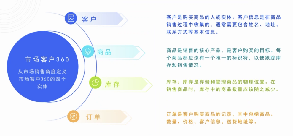 以电商业务为例,先定义一个广义上的市场客户360 的业务主题,在该业务主题下,主要主要包括四个实体——客户、商品、库存和订单。其中,客户是核心实体,与其他三个实体共同配合,最终完成了市场客户销售过程和行为的落地。