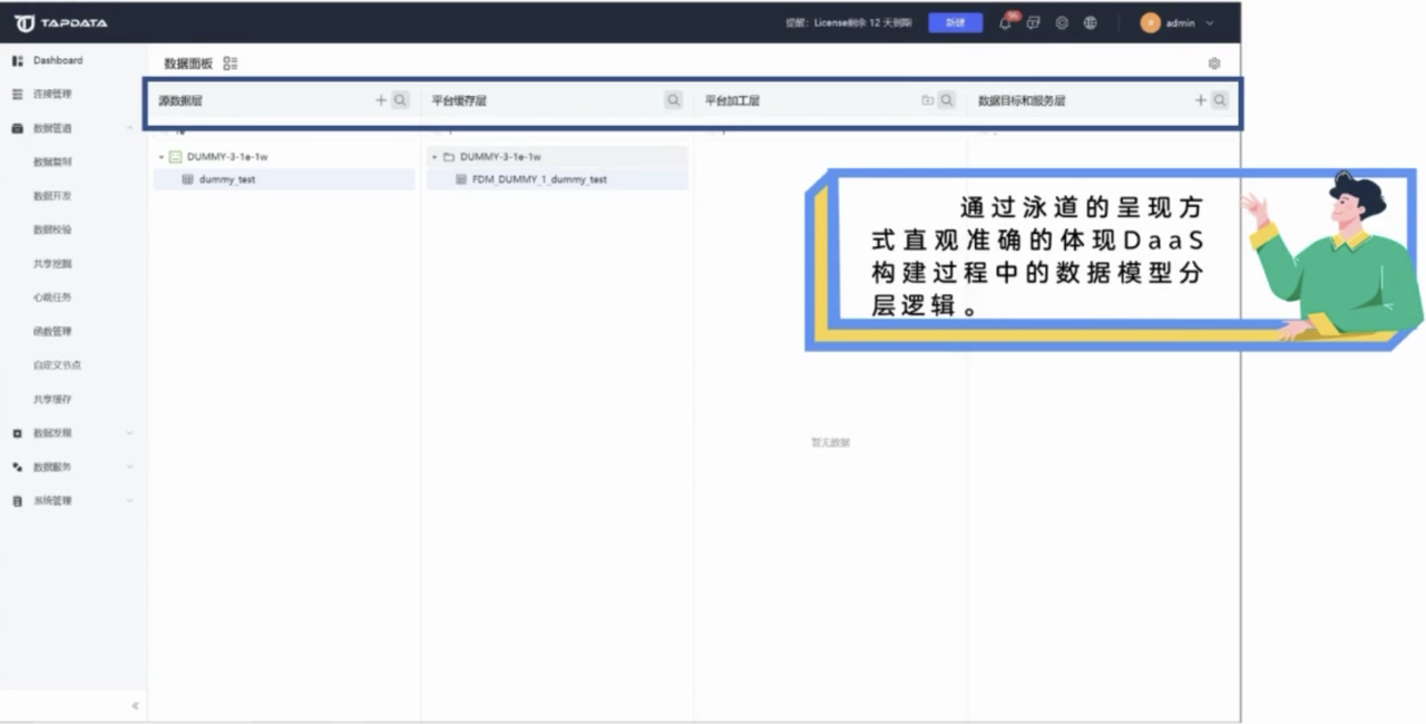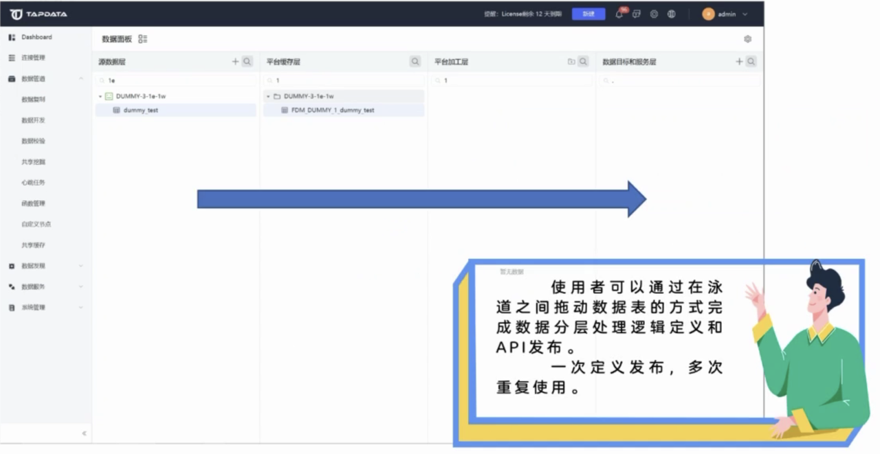 其二,使用者可以通过在泳道之间拖动数据表的方式,完成数据分层处理逻辑的定义和 API 发布。一次定义和发布可以支持多次的重复使用。