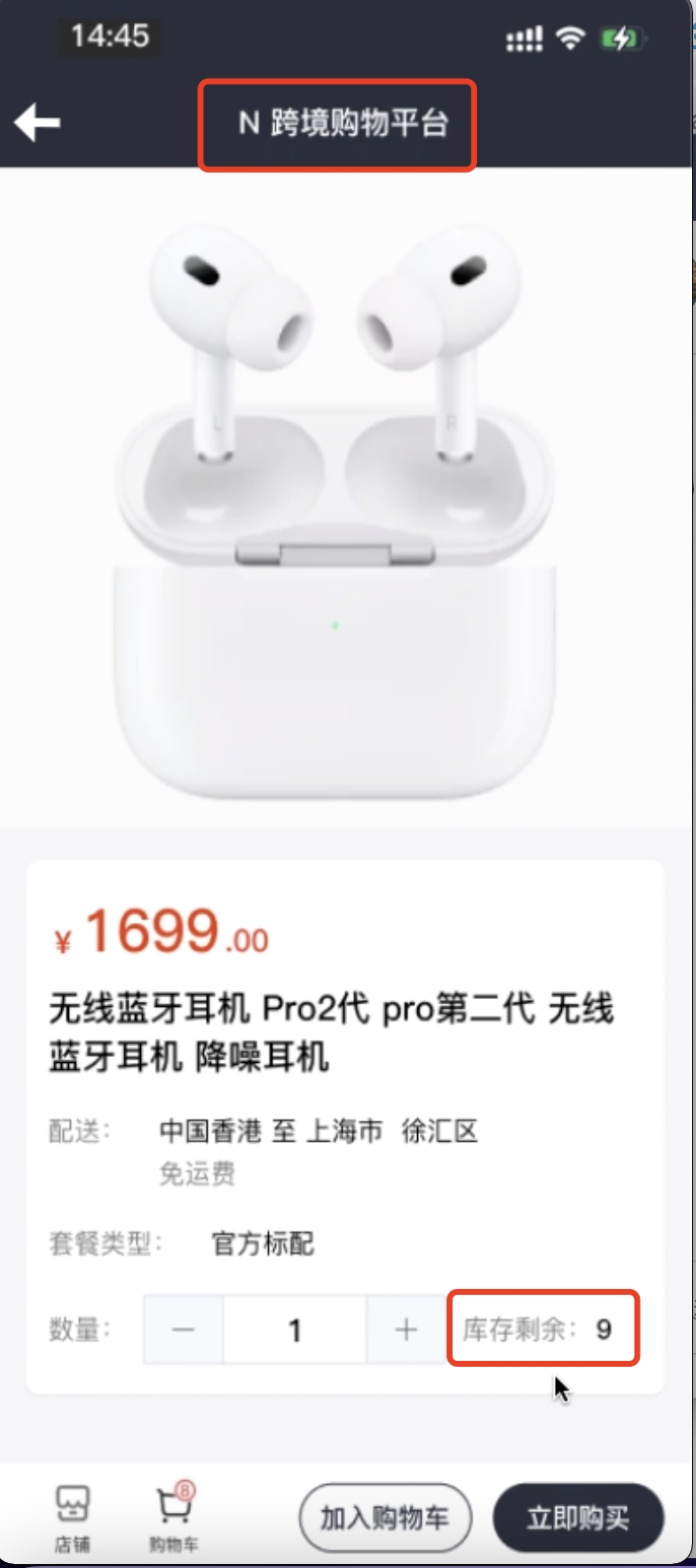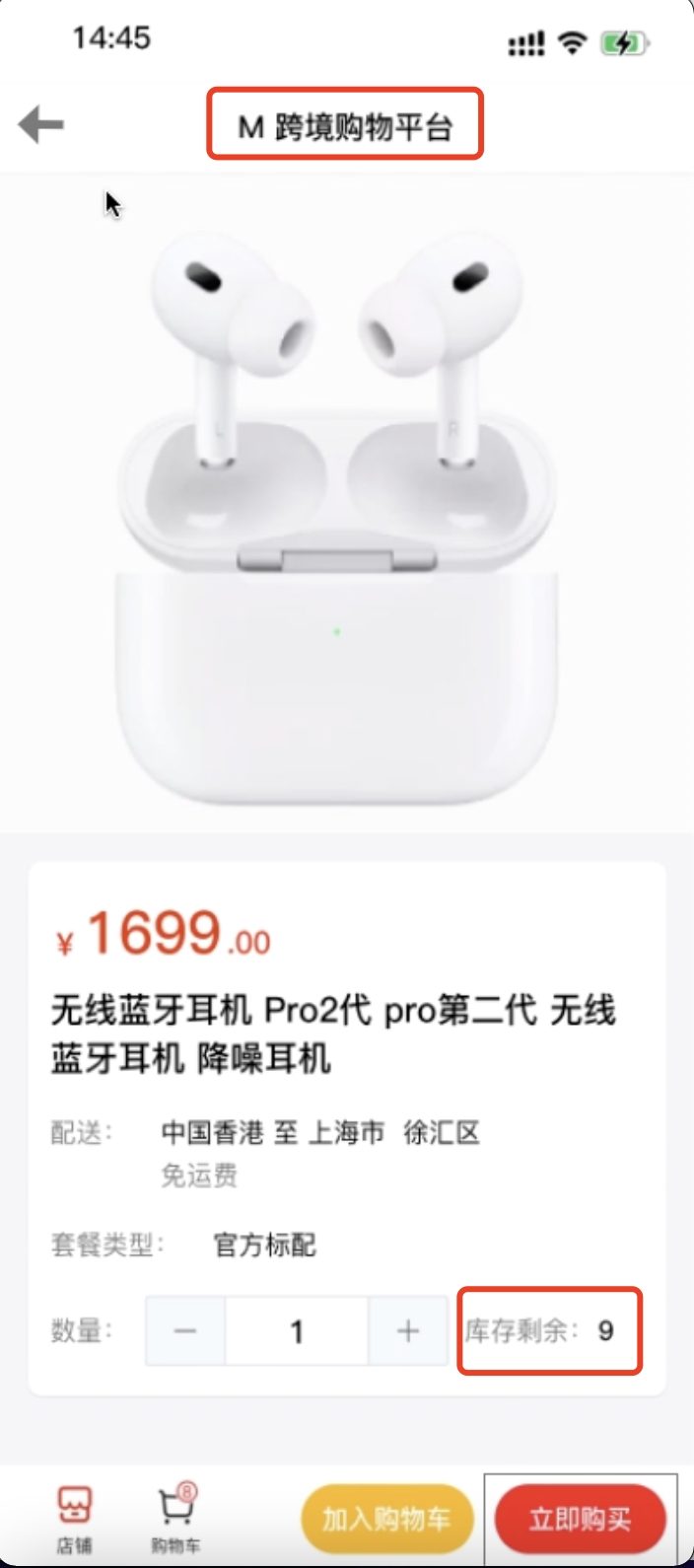 先在 M 平台上,查询到某款蓝牙耳机的库存剩余量为 9