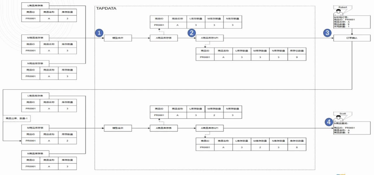 电商 L 的商品分布在自营、M 平台和 N 平台的库存中,而这三个库存都是独立的仓库系统,用户在不同渠道下采购时,需要及时更新并同步相关商品的库存数量。如果现在 M 平台的用户 Robert 在平台上下单采购 1 件商品 A,他看到的库存总数应该是这三方的库存数量的总和,而在他提交订单后,商品 A 库存总数 -1 的同时,变化后的库存总数会实时更新到各系统,同时体现在 M 平台和 N 平台上。此时 N 平台用户 Scott 如果打开商品 A 的查询页,显示的库存总数应该是更新后的数量,即与 M 平台一致,这也是该场景的核心点。
